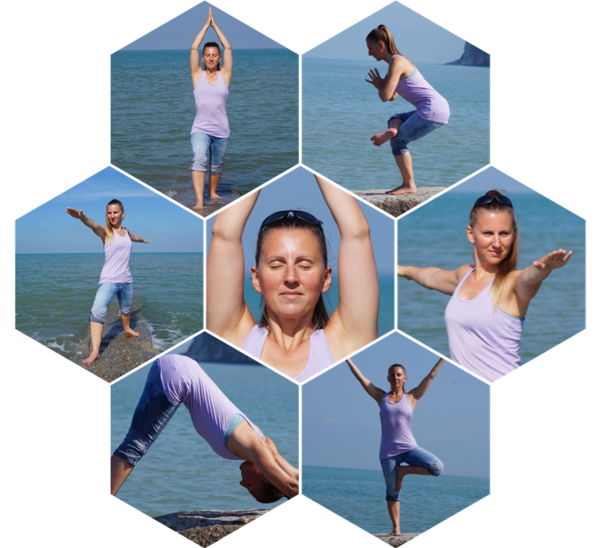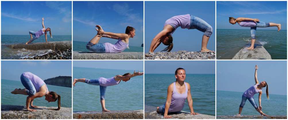Wir probieren neue Asanas (Haltungen) aus, die jede Woche wechseln: Standhaltungen, Vorbeugen,